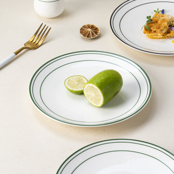 YAYU OEM personalizado Hotel línea negra platos de porcelana plana blanca parrilla borde verde cerámica aperitivo plato de cena para restaurante